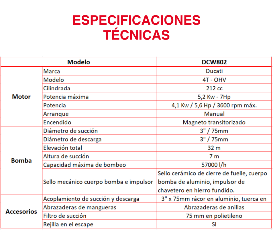 La potencia de la Motobomba DUCATI DCW802 Cuenta con un poderoso motor de 4 tiempos y un impulsor optimizado, otorgando así gran eficiencia, potencia y aprovechamiento óptimo de combustible.